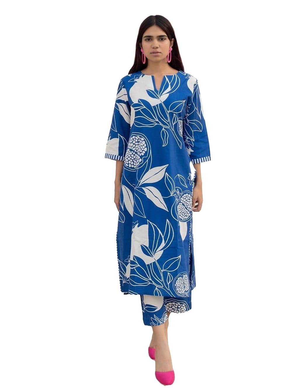 LookMark Women Cotton Blend Floral Printed Kurti And Pant Set with 3/4th Sleeves, Calf Length and V-Neck